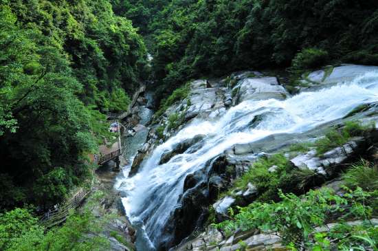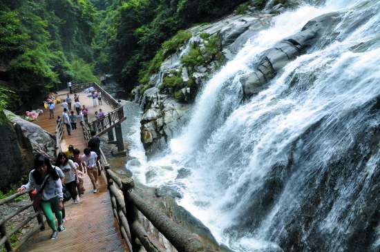 一路往上,亲水近瀑,随着脚步向前,就渐渐听到了泉水飞泻而下的“哗哗”声,传说中壮丽的瀑布群便近在眼前。一开始还只是小规模的瀑布,泉水顺着山石自然形成的轨道奔向下游。越往上走,水流越急、瀑布的规模也越大,而每当大家以为这已是最大规模的瀑布时,前面的瀑布又会突然从山林中“冒”出来——瀑布在绝壁之上腾空而下,极高的落差,犹如一条白练当空悬挂。