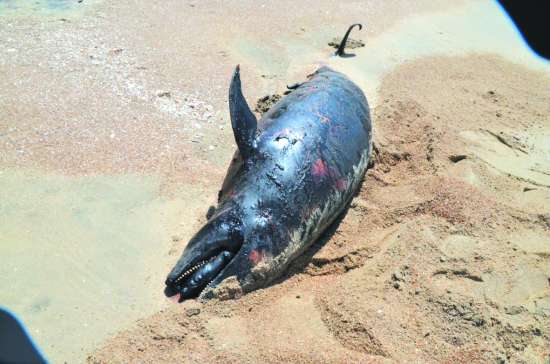 近日,南澳县云澳镇的沙滩上出现了一只搁浅的海豚。不幸的是,当人们发现它时已经死亡。搁浅的海豚长约2.8米,重八、九十公斤,初步鉴定为江豚,由于身体已经出现腐烂,搁浅原因无法确定。自然死亡、渔船误捕受伤、声呐系统受损都可能导致海豚搁浅。南澎列岛海洋生态自然国家级自然保护区工作人员提醒岛民,如果发现此类情况,应立即向有关部门报告。