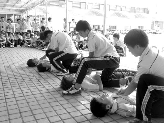 本报讯(记者 肖彤兰 摄影报道) 随着夏季暑假的即将来临,中小学生防溺水教育再次成为社会关注热点。昨天上午,在潮汕体育馆400名学生在广场游泳池边学防溺水与自救技巧(左图)。