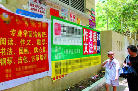 连日来,记者在市区桂花小学、蓝天小学、天竺中学等学校门口看到,一些年轻人专门候在校门口等学生上放学,往学生、家长手里递各类培训广告传单。在桂花小学门口,培训机构在绿化树之间横七竖八地挂起横幅,上面写着各种广告语及联系方式。学生家长王女士、付女士告诉记者,每年临近学期末,她们总会收到不少广告传单,“最多的一天收到过十几张。”记者巡城时还发现,市区一些学校周边建筑物的墙壁,长平大厦、汕头购书中心大楼等一些大楼内的电梯旁、楼道里,也都粘贴了不少培训班的广告信息。