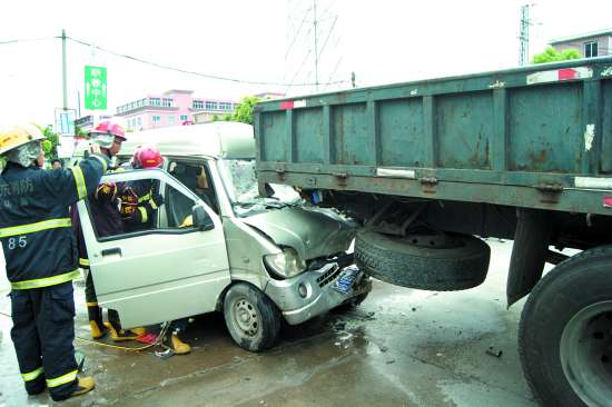 当天中午12时,澄海消防中队接报后赶到现场,经勘查,事故为一辆微型面包车追尾一辆大货车,面包车驾驶室严重变形,司机被困车内,情况危急。消防官兵一边安慰伤者,一边拆毁汽车挡风玻璃两侧框架。经过10多分钟努力,受伤司机被安全救出,移交给现场医护人员处置。