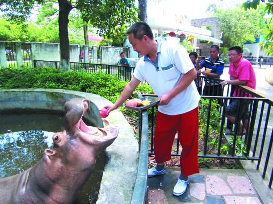 另外,动物园内的河马及猴子等还津津有味地吃上了西瓜和苹果等水果。“近日来,我们还及时为这些动物调整饮食结构,防暑和增强营养双管齐下。”卢先生告诉记者。最近一段时间来,不少动物胃口大开,除了老虎和狮子等肉食动物每餐的供肉量明显增多外,河马等草食动物所吃的鲜果量也是大幅度增加。