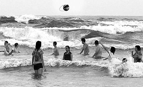 记者看到,海滩旁的沙地上停满了泳客的摩托车和汽车。海边泳客们正在“碧波冲浪”,男女老少都有。一当地人表示,每逢双休日,这里海滩上黑压压尽是泳客,人声鼎沸,十分热闹,海面上游泳者也如“下饺子”般密集。