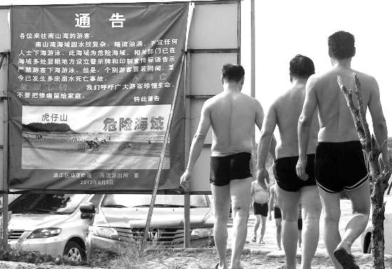 “一人溺亡、全家心碎”、“珍惜生命、严禁下海游泳”,记者注意到,在进入海滩的沙地上,有关部门竖立多块大幅警示牌说明该水域的危险海况,禁止泳客下海游泳。但前来游泳的人们对如此醒目警示牌都毫不在意,统统视而不见。泳客们谈笑风生从警示牌前经过,然后迫不及待加快脚步冲进海中。