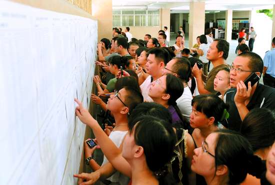 图为昨天“金实”初中入学考试成绩放榜,家长和学生焦急地关注考试成绩。本报记者 李俊伟 摄