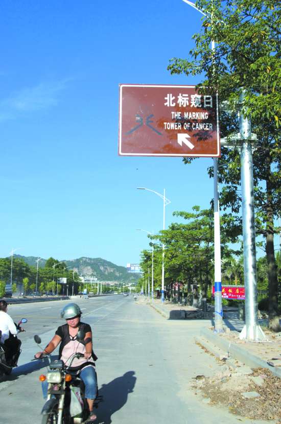 本报讯 (记者袁笙 实习生杨锋摄影报道)北回归线标志塔路牌上的英文竟然成了“癌症之塔”?近日,有市民路经大学路时,细心地发现了这样一个问题。到底这样的翻译有问题吗?记者进行了一番走访。