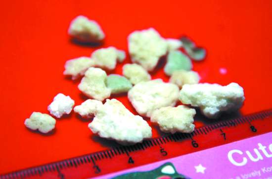 蔡女士一家对此情况担心起来,难道这两年他们一家都在吃“问题大米”。为此,她对发现的“硬块”进行了一番“实验”。因为一开始怀疑这些硬物是商家用来给大米上光的残留蜡块,所以她便用打火机烧这些“硬块”,但结果“硬块”不仅没熔化却反而散发出一股类似大米烧焦的味道。随后,她又将“硬块”放入装有水的碗中,“硬块”均沉到了碗底,第二天发现,这些泡在水中的小“硬块”开始变软且开始溶化,水变成了淡淡的乳白色。