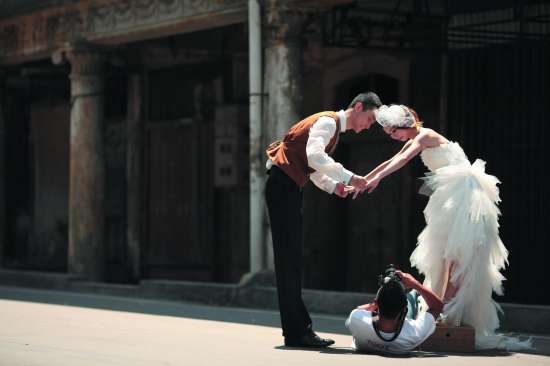 本报讯(记者 方晓F 摄影报道) 午后一点,正是炎炎夏季最热时分,烈日炙烤大地,户外无遮阳的地方处处热浪滚滚。在龙湖沟旁的一片草地上,摄影师陶然正趴着为客人拍摄婚纱照,为了稳定相机,他的前胸必须紧紧贴着地面,双肘也必须撑在热气腾腾的地上……躺着或趴在热得可以煎蛋的地上拍照,这对于婚纱外景摄影师来说,早已是一件习以为常的事情。