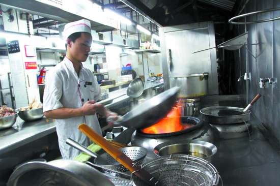 小餐馆厨房热似火,大酒楼后厨的温度也不低。在一家酒楼的厨房里,此时还未正式生火起炉,只有一个大汤锅在加热沸腾,滚滚白汽让人一靠近便顿感温度骤升。行政主厨郑创坤说,七个炒锅一齐开火时,这里的温度可以飙升到45℃,厨师站在炉边不用半小时就会浑身大汗,为了防暑降温,他们每人每天得喝上1000毫升的白开水。