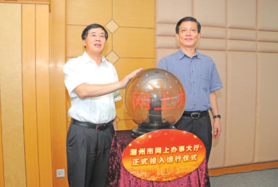 仪式上,市委书记、市人大常委会主任许光宣布“潮州市网上办事大厅正式投入运行”,并和市委副书记、市长李庆雄共同按下启动球。据了解,市网上办事大厅建设自启动以来,在时间紧、任务重的情况下,市各有关部门大力配合协作,各项工作进展顺利,提前完成省下达的任务,并按既定时间进度要求正式投入运行。