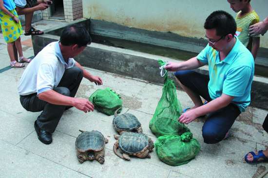 本报讯(记者 黄泽春 摄影报道)继前段时间有热心市民将一只大鳄龟送到市区中山公园动物园寄养之后,近日,潮南区陈店镇的陈先生又向市野生动植物保护办移交了6只大龟。经鉴定,这些大龟同样为鳄龟,目前也已寄养于中山公园动物园。