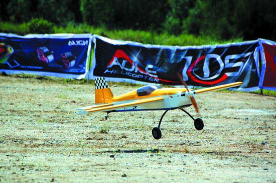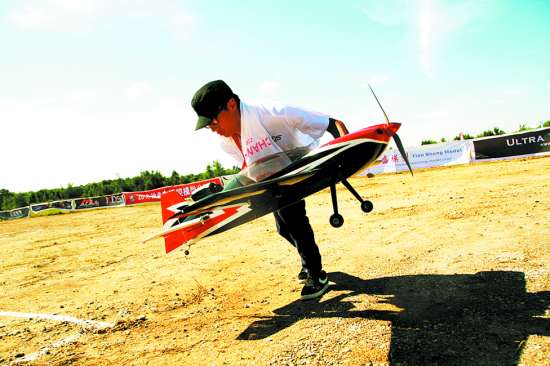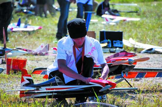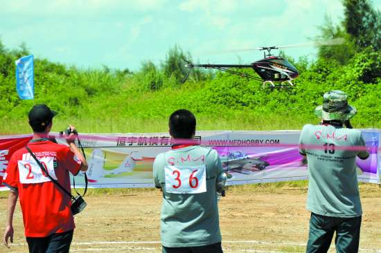 蓝天白云,天公作美。午后,火辣辣的太阳炙烤大地,在莱芜一片草地上,一条由砂石铺设而成的平坦跑道从草地中延伸开去。数十名航模爱好者守候跑道一侧,有的手握遥控器熟悉动作,有的为航模飞行作最后检查。“三、二、一,开始!”主持人话音刚落,航模爱好者迅速拨动遥控器按钮,跑道上的航模犹如真实飞机一样,随即加大马力腾空而起。拉高、平飞、横滚、侧飞、旋转、熄火、降落……尽管每架航模的表演时间只有2分钟,但在空中飞翔时完成的每个高难度动作,无不让众人啧啧称奇。