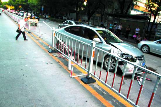 本报讯(记者 林彦恂 杨立轩 实习生 林晓红 摄影报道)昨天下午5时多,金湖路芙蓉园公交站附近发生一起车祸,一辆自东向西行驶的银色现代小轿车与刚出站的公交车发生碰撞后,穿过道路中间隔离栏,再冲向对面方向车道。幸好,事故没有造成人员伤亡。