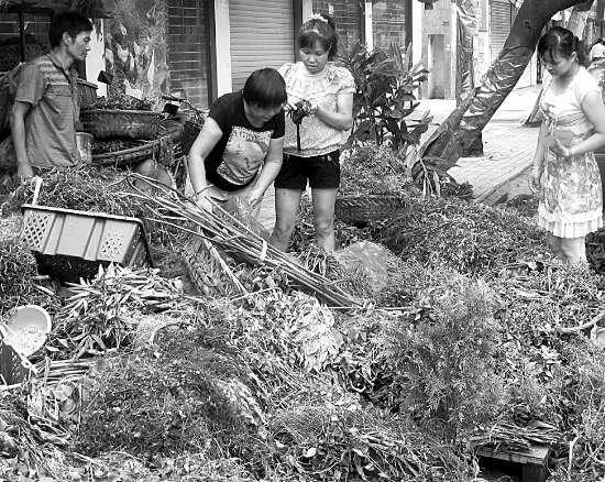 潮汕人大暑天都喜欢喝“青草水”去湿降火,连一些小毛病有时都会自己买“青草”回家调养。一到盛夏,市民陈女士总是会给家人买草药防暑。她说现在市场上除了日常的青菜水果,不少小贩也采摘了一些大家熟悉的金银花、蛇舌草、荷叶来卖,生意很好。