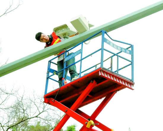 图:工作人员头顶烈日高空作业安装交通监摄设施。 本报记者 方淦明 摄