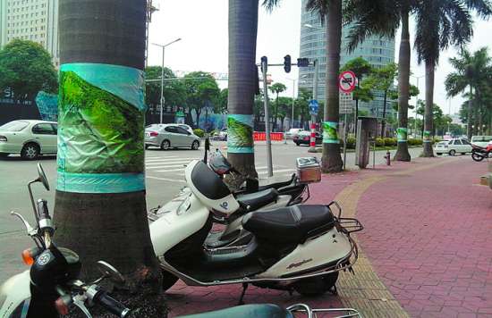 市有关部门指出,去年实施的《汕头市城市绿化管理条例》,对破坏树木行为的界定和处罚都作出了规定。第三十八条明确指出,禁止在树木上悬挂或者张贴广告、标语;在树木或绿化设施上涂、写、刻、画和悬挂重物;在城市绿地内设置摊点或者进行经营活动;在城市绿地内采石取土、乱搭建;损坏绿化的娱乐活动等9项行为。而违反规定的,将可以处予罚款100元至5000元不等,造成损失的还应当赔偿损失。本报记者 赖淑英 实习生 方澄 摄影报道