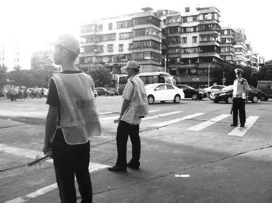 本报讯 (记者刘婉萍 摄影报道)近段时间,细心的市民或许会留意到,我市中心城区部分交通繁忙的路口出现了一些特殊的“交通协管员”。他们或身着“自愿协管”的黄马甲,或穿着“文明交通,从我做起”字样的绿马甲,手持红旗,在路口协助执勤交警劝导行人和非机动车遵守交通信号灯及按道行驶(上图)。