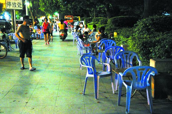 炎热夏天,许多市民都喜欢夜间到人民广场吹风纳凉。不过,经常到广场锻炼身体的市民近来发现,每天晚饭过后,广场内人山人海,广场外也同样热闹非凡,因为这段时间内,整个广场外围的人行步道被数百张茶桌霸占,这些茶桌由多个临时茶摊经营者设置,密布在广场各大入口及公交车站附近。