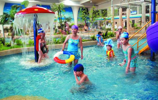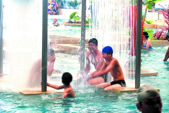 市区金东花园、金新花园等配套有游泳池的住宅小区,每年夏天也笑迎“四方宾客”,不少市民“全家老小齐上阵”,夏夜里,这些包含游泳培训的游泳池内水面上密集的泳客尤如“下饺子”般热闹。“这两天太闷热了,来学习游泳的人比以前翻了一番。一般情况下,悟性高、胆子大的孩子一期下来基本就会游了。但要想姿势到位、耐力持久,还需后续课程的训练。”一位游泳教练说,他教的学生中除了小学生也不乏三四十岁的大人,天气越热,教练们就越忙。同样,在市区的“梦之湖”水都,每天也都挤满了泳客,特别是孩子们在玩水功能区上演“拨水节”,让透心清凉的清水洗去了身上的暑热。