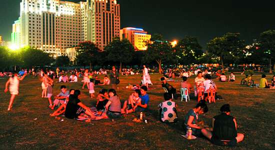 近来天气炎热,时代广场成为人们晚上乘凉消暑的好去处,草地坐满了喝茶聊天的市民。本报记者 张烈华 摄