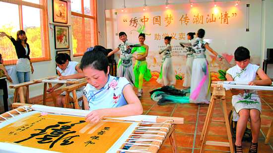 左图:11日下午,金平区侨联、市裕虹钉金绣传承中心联合举办“绣中国梦·传潮汕情”义卖助学暨七夕乞巧潮绣体验。绣师及聋哑师生联合表演舞蹈《祈福》,汉服社志愿者在现场进行刺绣比赛。