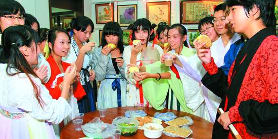 上图:今天是“七夕节”,又为“乞巧节”。11日,汕头汉服爱好者聚会迎接这个最具浪漫色彩的传统节日。他们通过学习潮绣、茶艺、舞蹈等中华传统文化,提高自身修养,创造美好生活。图为女孩子们制作“巧果”给大家品尝。