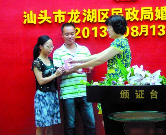 昨天上午8点15分,距龙湖区婚姻登记处开放办公还有10多分钟,已经有好几对新人在门口等待,很多新人是特地请假前来登记结婚的。在登记处大厅,各角落坐满了一对对前来登记结婚的新人。不到一个小时,就有近20对情侣办好了结婚登记。刚和爱人领完小红本出来,李先生松了一口气,他笑哈哈地告诉记者,本来一星期前就打算过来登记了,为了七夕这个节日,他们把婚期往后推了几天,今天终于领到证了,心里很踏实。