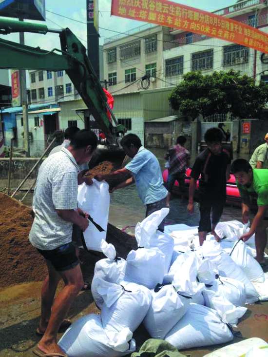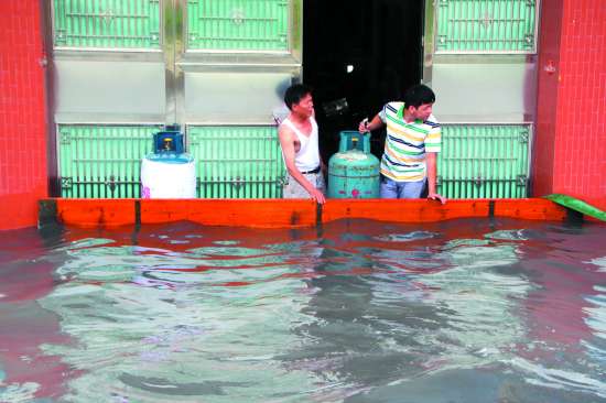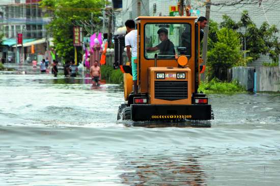 据介绍,经过一夜暴雨的谷饶镇,到了昨天下午仍有多条道路及多个村落的积水尚未消退。昨天下午,记者在受浸最严重的溪美村看到,被暴雨冲垮的堤围已填上沙包,进入村落的道路积水仍十分严重,水深及腰,从一侧的厂房围墙可见,水位最高时接近一名成年人的身高。村民外出时需要涉水而行,一些村民用水管将屋内的积水向外排泄,汽车司机见此则纷纷绕道而行。在一旁的谷饶溪,水位依然高过路面,谷饶镇政府工作人员告诉记者,尽管暴雨已停,但由于谷饶镇地理位置特殊,上游的大量溪水依然源源不断向下游涌来。