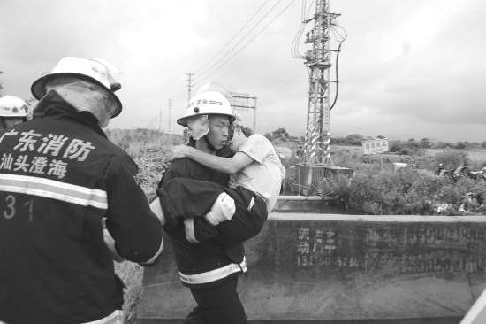 当天下午4时多,澄海消防中队接报后来到现场,看到两辆小轿车发生严重碰撞,两车内共有5人被困。由于其中一辆轿车车门严重卡死,无法打开,消防官兵马上用液压扩张器进行扩张,再用铁铤撬开车门,把车内3名流血且处于昏迷状态的司乘人员救出送医。随后,消防官兵又用千斤顶住另一辆事故车的变形车头,救出了车内被困的2名群众。