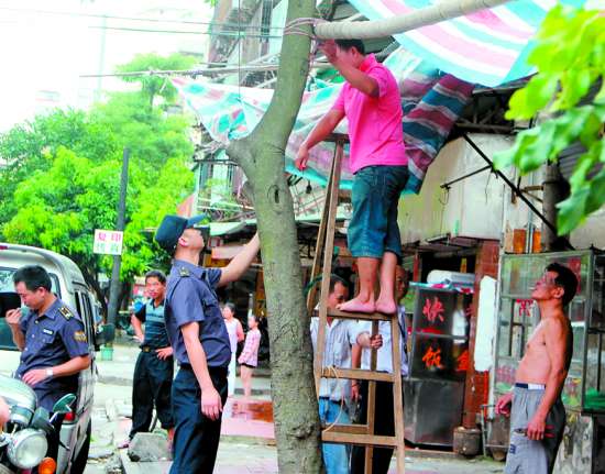针对饶平路沿街商铺占用步道严重的问题,联合整治队对各家违章商户都进行批评教育,要求其将占道的物品撤进店内。在饶平路中段,一家饮食店为了方便经营,竟利用店门前的两棵路树作为支柱,搭起了一个简易棚架,执法人员发现后,立刻责令店主自行拆除违章设施,并在现场进行监督。
