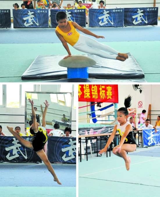 经过两天的角逐,由市体育局主办的2013汕头少年儿童体操锦标赛昨天在潮汕体育馆闭幕,我市各区县的近百名小选手参加了比赛。金平金砂小学队一枝独秀,他们共夺得8项个人冠军,并以267分的成绩获团体桂冠,龙湖区队、澄海区队分获团体二、三名。图为比赛场面。