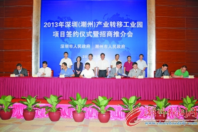 本报深圳电(记者 袁晓金)昨天,2013年深圳(潮州)产业转移工业园项目签约仪式暨招商推介会在深圳市五洲宾馆隆重举行,会上有15个项目签约,涵盖了基础设施、电子信息、商贸物流、能源石化、文化旅游等领域,签约总金额超过300亿元。