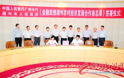 本报讯(记者 杨蕾 实习生 周璐璐) 前天下午,中国人民银行广州分行与潮州市政府共同签署《金融助推潮州农村经济发展合作备忘录》,并进行银企合作协议签订仪式。