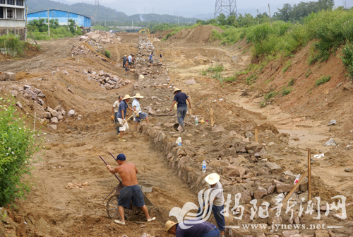 揭东区加快城区扩容提质步伐,采取强有力措施,大力推进重点基础设施建设。图为车田河片区市政景观综合工程施工场面。