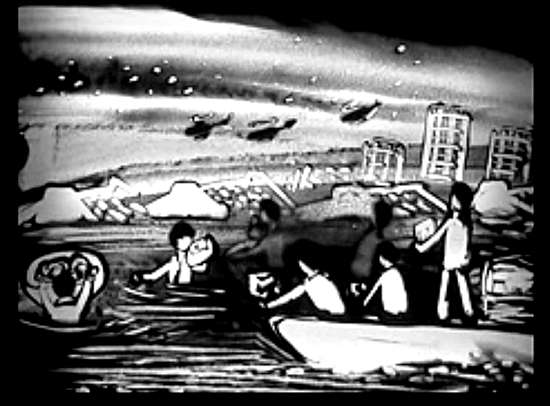 原本平静的镇区上空,突然乌云密布,下起了大暴雨,渐渐地,积水漫上了街道,直至将低矮的平房淹没……赶往灾区的救援人员驾船在积水中营救被困群众,来自远方的直升机将救援物资空投到受灾地区(见图)……在这段4分钟的沙画视频当中,作者用自己手中的细沙,将灾区受灾和救灾场面一一重现。截至目前,仅原始视频便有4万多次的点播量。网友们也纷纷留言,以此祝福灾区。