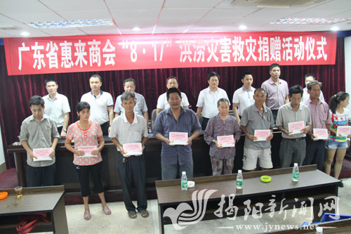 11日至12日,广东省惠来商会在惠来县民政局有关同志的引领下,深入民间乡村,对这次受到"尤特""潭美"台风影响的贫困户、孤寡老人、五保户进行慰问。据了解,受强盛西南季风影响,8月17日,惠来县遭受历史罕见特大暴雨袭击,全县6个镇属重灾区,55个乡村不同程度受洪水围困,受灾人口达31.79万人,房屋倒塌损坏145户共179间,其中全倒户22户22间、严重损坏46户55间,直接经济损失4248万元,全县直接经济损失达2.213亿元。广东省惠来商会的代表们对受灾群众问寒问暖,关心受灾情况,对房屋倒塌户与病困户致以亲切的关心与热情的问候,对房屋全倒塌的19户每户赠送资金1万元,其他的困难户根据不同受灾情况也送上了慰问金。据悉,这次慰问农村受灾倒房户与贫困户,广东省惠来商会的老板们共损资51万元。