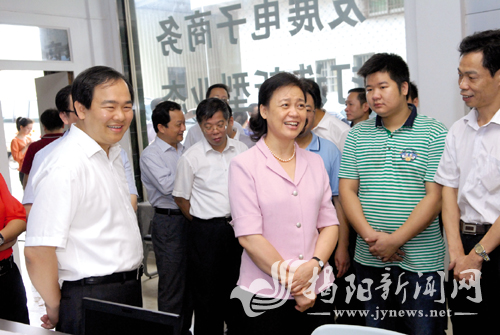 招玉芳极其关注我市在发展电子商务新业态所作的积极探索。在揭东区锡场镇军埔村,她细致地考察了电商服务中心(见图。郑楚藩 摄)、揭东农信社服务站,并与网商亲切交谈,详细了解网店经营情况,殷切寄语青年网商们要守住质量这条底线,靠诚信经营做大做强,努力使自己的品牌从国内走向国际。