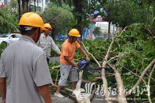 惠来县迅速清理被台风破坏的广告牌、灯箱及倒折树木,尽快消灭灾痕,恢复正常生活生产秩序。陈锡辉 摄