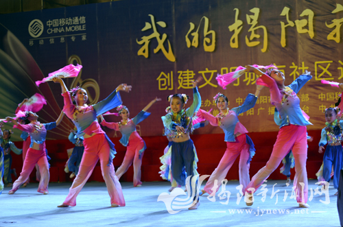 如梦如幻的舞台上,聚光灯闪耀四射,欢快喜庆的开场舞《龙腾揭阳》拉开帷幕。旋律动听的原创歌曲《两千年的请柬》唱出了揭阳优美的环境和深厚的历史人文气息;浪漫抒情的《神奇的阳美》完美地诠释揭阳玉器产业辉煌的发展历程;男女声二重唱《家住榕江边》,仿佛把观众带进了波光荡漾、莲香扑鼻的岭南特色水城;激情四射的舞蹈《红红的日子火火的爱》,传递着老百姓对家乡的热爱,对幸福生活的讴歌……整场晚会高潮迭起,掌声不断,“崇文、尚信、勤行、致远”的新时期揭阳精神贯穿其中,轻松愉快的游戏问答环节引得台下观众积极参与,“你好”、“不客气”、“请笑纳”等文明用语也在问答中传递着文明和礼仪。