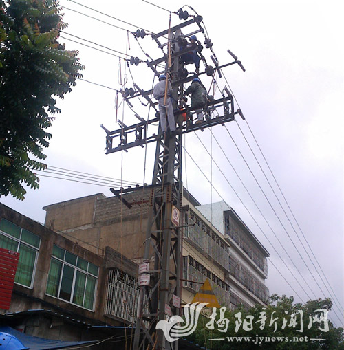 揭西供电局抢修人员咬紧牙关连续作战在一线。通讯员 摄