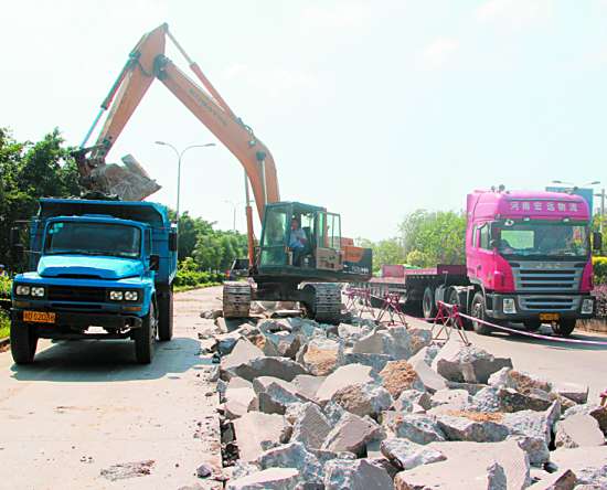 昨天上午,记者来到泰山路,在其中一些施工点,施工人员正驾驶大型机械,拆除破损的路面(见图)。而在海河路口与汕樟路口附近,两处破损的路面已经率先完成新路面的铺设,正在进行养护。据市政维修中心相关负责人陈先生介绍,泰山路路面维修工程分为两段,一段为泰山路金泰立交桥引道路段,全长516.25米,路面维修面积为1000平方米。另一段为长江路口至海河路口,全长约7公里,实际破损面积约1.8万平方米,现拟维修面积约1.1万平方米。泰山路路面维修分东、西两侧进行,现在已经进行泰山路东侧自北向南车道的维修。整个施工工期为50天,力争在侨博会之前全部完工。
