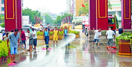 昨天上午,记者来到中山公园,看到工作人员正忙着从货车上卸下重新购置的盆栽,并把这些花花草草摆放在公园正面入口处及园道两侧。另外,中山公园还请来了消防官兵帮忙清洗园区。两辆消防车装上了6.5厘米口径的水管,急促的水流喷向路面,工作人员趁着水势用扫帚迅速把垃圾清理掉。据公园负责人贝建真介绍,强台风过后,抗灾复产工作全面铺开,连日来园方组织一百多名人员加班加点,全力以赴维修受损设施,清理园区环境。目前公园各项复产工作大部分完成,预计10月1日即可对外开放,国庆期间公园还将举行民俗文化展览。