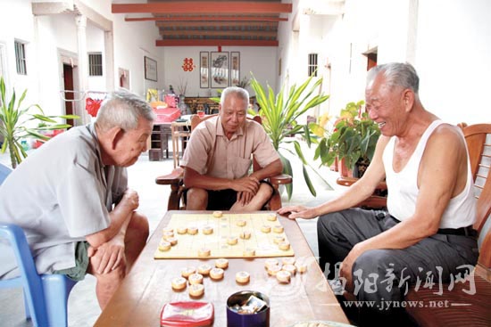 在此次强台风中,灾情较严重的榕城下义村迅速恢复生产生活。图为村民在家里下棋。杨继斌 摄