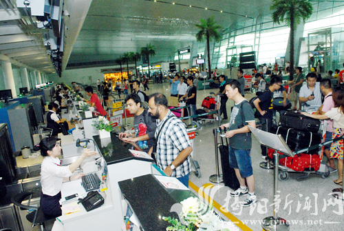 今年国庆黄金周,市民出游热情高涨。图为旅客正在揭阳潮汕机场办理登机手续。郑楚藩 摄