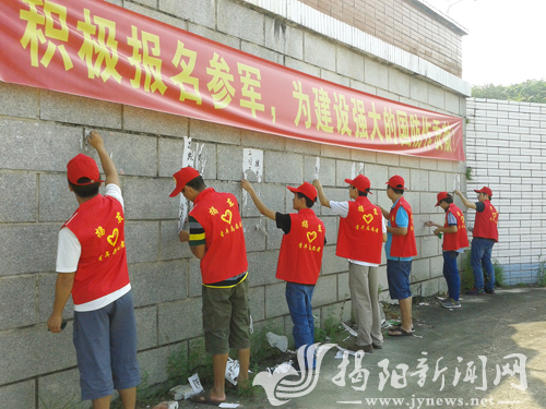 该队经常组织环境大整治志愿服务活动,图为志愿者清除张贴在墙上的“牛皮癣”广告。 通讯员 摄