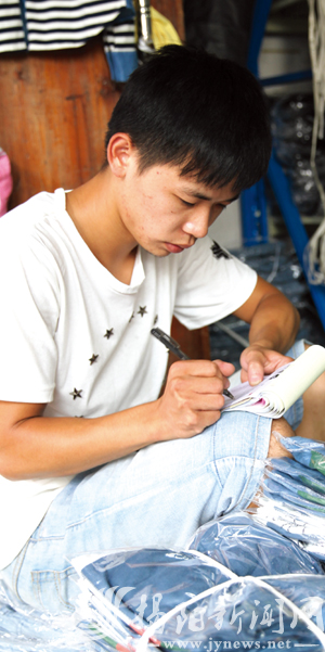 每天下午,军埔村的小电商们将当天的订单打出来,3时前后就蜂拥至“YES潮服饰”这样的大店调货,然后包装、贴单,等快递车来时,随“YES潮服饰”等大店的订单一起让快递员取走。