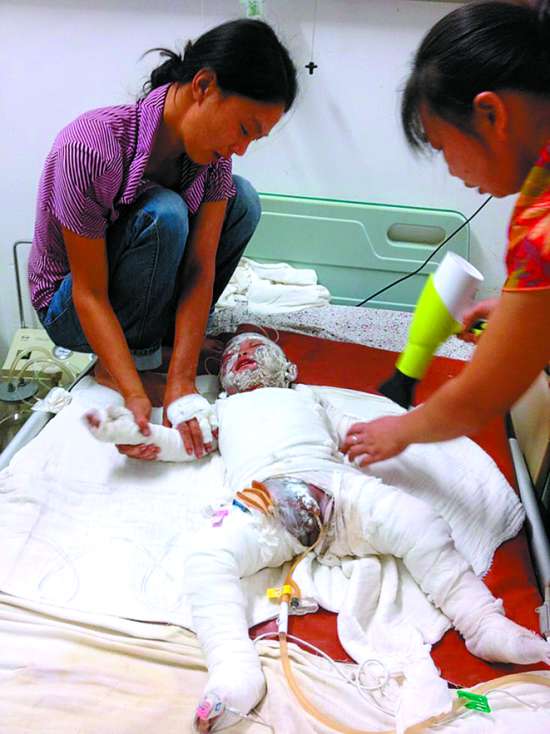 病房中,小天豪的妈妈和姑姑向记者哭诉了事情的经过。小天豪一家都来自重庆,父母在我市赤窖西陇化工附近养猪两三年了。11日早上,小天豪的妈妈去田里割猪草,爸爸去外面收废品。8点多,小天豪的爷爷端出一锅刚刚熬好的猪食,倒在一个水泥槽里准备喂猪,蹦蹦跳跳的小天豪就跟在爷爷后面,突然掉进了水泥槽里,瞬间被猪食淹没,发出了凄厉的惨叫声。爷爷和闻讯赶来的妈妈赶紧捞出了孩子,只见油腻腻的猪食粘在孩子身上,妈妈手忙脚乱地脱掉孩子的衣服,孩子全身的皮随之脱落。家里人把几近休克的孩子送到医院,经过医生的全力抢救,目前孩子生命体征稳定。医生告诉记者,小天豪全身95%深二度和深三度烧伤,处于危险期,接下来还要渡过感染期,再视情况进行植皮。小天豪一家经济非常困难,父亲因先天性心脏病4年前做了手术,已经欠下近十万元的债务。小天豪出事,家里东凑西借才凑到1万多元,目前缺乏医药费急待救援。(奖励报料人刘小姐100元中国移动手机充值卡)