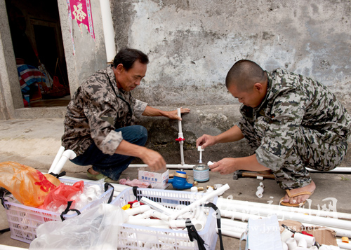 揭西县南山镇旅港乡亲杨碧军先生热心家乡公益事业,近年来已在南山镇捐资250多万元,用于修桥造路及水利设施、学校建设等。最近,杨先生又捐资20多万元,铺设7000多米的水管,使火炬村400多户村民用上自来水。杨先生的善举深受群众称赞。图为工程人员在安装供水设备。