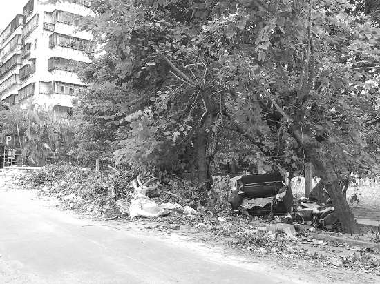昨天上午8点半左右,记者来到衡山路丹阳庄小区,在其中一出入口,记者看到,街道两边的人行步道均堆放有大片枯死的树枝树叶,废弃的沙发、木板、碎玻璃等杂物大量堆积散落,俨然乱糟糟的垃圾堆。多棵街边树东倒西歪,部分树干光秃秃,仅留下折断后的几段树枝张牙舞爪,有碍市容美观。