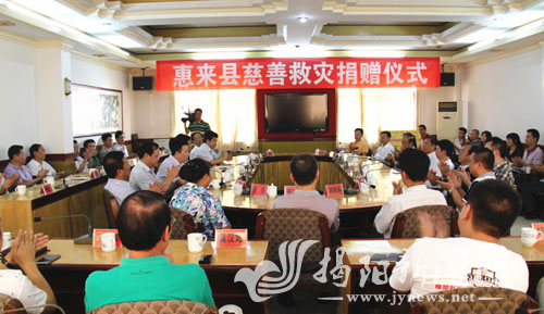 10月9日,惠来县委县政府在惠来举行"慈善救灾捐款仪式",代表受灾群众接受捐赠,向捐赠者回馈牌匾。县领导林旭群、方如隆、方汉明、蔡合城、戎铁辉、贝继勤、黄镇城、史创东,黄少波等有关领导以及广东省惠来商会常务副会长兼秘书长方兆康,常务副会长吴汉林、吴汉龙,副会长王武丰,香港惠来商会代表吴立辉、林辉升、林俊生等出席了捐赠仪式。